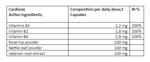 Cardione is een voedingssupplement met natuurlijke ingrediënten dat verschillende gezondheidsbevorderende effecten heeft. Bovenal heeft het een bloeddruk- en bloedsuikerregulerende werking. Het is bekend dat de omega-3-vetzuren die het bevat een positief effect hebben op de algemene gezondheid en de bloedwaarden verbeteren. Cardion draagt bij aan de normalisatie van de bloeddruk en vermindert het risico op hart- en vaatziekten zoals beroerte, hartaanval, atriumfibrilleren en cardio-neurose. Het kan ook nuttig zijn bij nierfalen. Door de bloeddruk op natuurlijke wijze te normaliseren, de vasculaire elasticiteit te herstellen en het cholesterolgehalte in het bloed te verlagen, beschermt Cardione tegen hartaanvallen en beroertes.